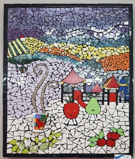 I commissioned Janet to mosaic a scene for our café in Donnybrook. As we support local producers in the café, I want this to reflect in the mosaic. Janet produced exacytly want we wanted, showing local fruit, the beautiful hills and orchards, she even included the famous Donnybrook childrens playground. The mosaics takes pride of place on our café wall.